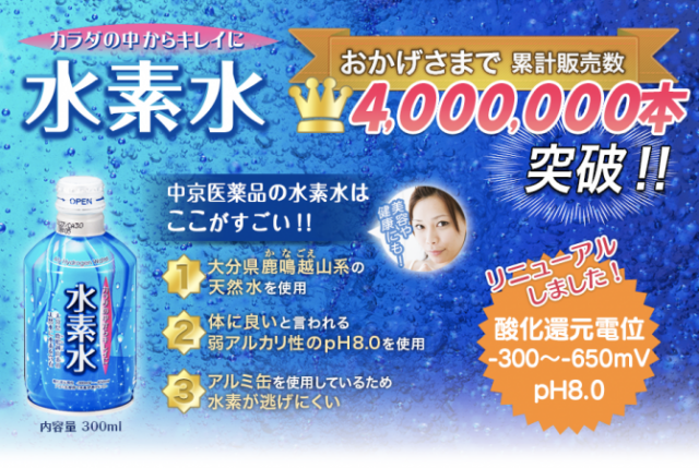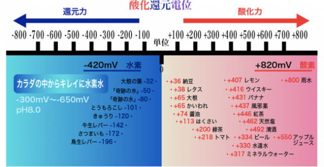 水素水の還元力は「酸化還元電位」という値で表されます。「カラダの中からキレイに水素水」は酸化還元電位「-300~-650mV」という高い還元力を持った水素水です。
