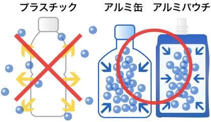 「カラダの中からキレイに水素水」がアルミ缶の容器を使用しているのは、水素を逃がし難くする為です。ペットボトルのような容器だと水素が空気中に放出し てしまいますので、アルミ缶に入れることでこれを防いでいます。アルミパウチでも水素の放出をある程度防げますが、キャップがプラスチック素材の為、水素 の減りが早く、アルミ缶の方がより長く水素を封入できます。
